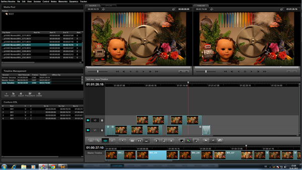 Dennoch kann man wieder alternativ im Viewer-Fenster die Vorschau genießen (hier auch mit der Intesity im Parallel-Betrieb). Dazu beherrscht DaVinci auch noch zahlreiche GPU-Effekte wie Skalieren, Drehen oder Blur. Gegenüber anderen kommerziellen Lösungen vermisst man am ehesten eine Slow-Motion, die Zwischenbilder interpoliert sowie einen Titeler. Doch auch ohne diese Funktionen dürfte man gerade in szenischen Projekten bereits mit dieser integrierten Schnittlösung nicht unbedingt schlecht fahren.