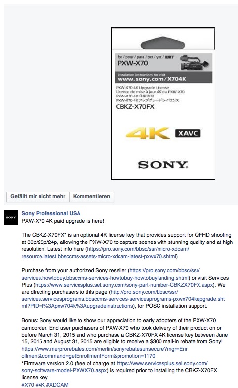 Noch nicht. Wenn hier die Kamera wie Blei in den Regalen liegt, weil man für 4K nicht 500€ extra zahlen möchte, wird Sony umdenken.iMac27_edmedia hat geschrieben:gerade die Antwort, dann verzichtet man lieber auf das Update: