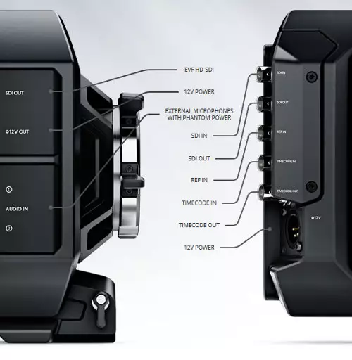 Ultra HD (3840x2160, also kein Cine-4K, mit bis zu 60p* / native Sensorauflösung) wird in 12 bit lossless Cinema DNG RAW oder in Apple ProRes 422 aufgenommen, und zwar nicht mehr auf SSD sondern auf CFast 2.0-Karten mit Datenraten bis zu 350 MB/s. Full HD kann mit bis zu 60p aufgezeichnet werden. An Anschlüssen sind 12G-SDI out sowie in (dazu ein extra SDI plus Stromversorgung für einen externen EVF), Timecode in/out, zwei XLR Audioeingänge mit 48v Phantomspeisung und LANC an Bord. Die Stromversorgung erfolgt über eine 4-pin 12V to 30V XLR Buchse (Standard).
