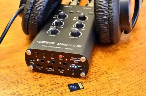 Das Mixerface R4R von CEntrance ist ein mobiler 4 Kanal Mixer - kaum größer als eine Zigarettenschatel - der mittels seiner zwei XLR-Klinken Combobuchsen (mit Phantompower) und zwei AUX Miniklinken-Eingänge über seine hochwertigen A/D Wandler (16/2432-bit, 44.1-192 kHz) Sounds digitalisieren und auf einer microSD-Karte aufnehmen oder/und als USB-Interface für iOS- und Android Smartphones/Tablets sowie Windows/Mac OS X Computer verwendet werden - es arbeitet mit den meisten Recording Apps zusammen.