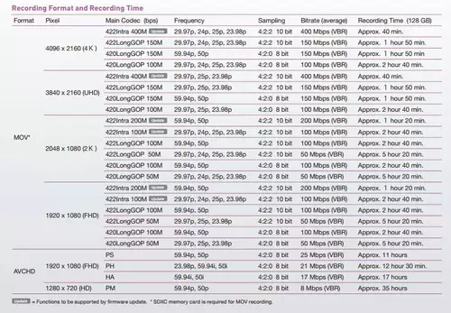 Intern wird die EVA1 Cinema-4K mit 150Mbps und 10bit 4:2:2 nur bei den Framerates 29.97p, 24p, 25p, 23.98p unterstützen, in 2K-Auflösung ist die 10bit Farbtiefe auch bei 59.94p/50p einstellbar, mit max. 100Mbps. Nach einem künftigen Firmware-Update wird die Kamera auch eine 4K-Aufzeichnung mit 400Mbps (422 All Intra) beherrschen sowie eine Ausgabe in 5.7K RAW an externe Recorder. Über HDMI ist zunächst ein 10bit 4:2:2 Signal in 4096x2160 verfügbar bei max. 59.94p, 50p. High Speed Aufnahmen lassen sich unter Nutzung der S35-Sensorfläche in 2K/HD mit 100/120fps erstellen, geht man auf 200/240fps wird ein 4/3" Crop ausgelesen.