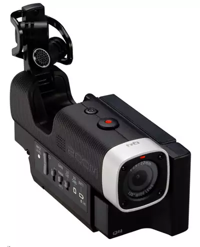 Mitte Dezember erscheint in Japan ein neuer Audiorecorder von Zoom, mit dem auch gefilmt werden kann. Bei dem Q4 orientiert sich Zoom -- anders als bisher -- eher am klassischen Camcorder-Design mit einem aufklappbaren LC-Display. Der Schwerpunkt des Geräts liegt jedoch immer noch auf der Audioaufnahme, denn die seitlich angebrachten Bedienelemente sind ausschließlich für die Tonkontrolle ausgelegt (Pegeln, Gain, Low-Cut-Filter). Die Mikrofoneinheit mit zwei Kapseln in XY-Stereoanordnung wird für die Aufnahme ausgeklappt. Ergänzend gibt es einen Mic-/Line in- Anschluß sowie einen Kopfhörerausgang.
