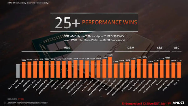 AMDs Threadripper Pro 3995WX schlägt diese ist in allen unterschiedlichen Benchmarks und ist in einzelnen bis zu 152% schneller (Adobe After Effects), in Premiere Pro sind es immerhin noch zwischen 125 und 135%. Einen Geschwindigkeitsvorteil soll auch die Einbindung zukünftiger (Quadro) GPUs über den schnellen PCI-Express 4.0 bringen - Intel unterstützt hier nur PCI-Express 3.0.