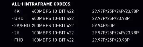 Ebenfalls bereits angekündigt und jetzt für das interne Recording hinzugekommen sind die All-I Formate (Intraframe Codecs). Hierzu zählen u.a. 4K (Cine) mit 400 Mbit/s in 10 Bit 4:2:2 mit max. 30 fps sowie UHD, 2K und FHD ebenfalls alle mit 10 Bit 4:2:2, wobei 2K/FHD mit max. 60p zur Verfügung stehen.