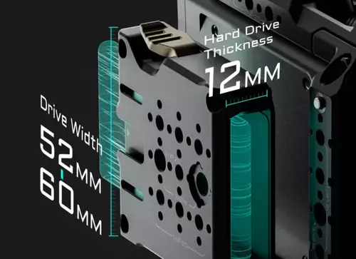 Auf der rechten Kameraseite lässt sich zusätzlich ein SSD-Träger/Einschub montieren, der SSDs mit einer breite zwischen 52-60mm und einer maximalen Höhe von 12mm aufnimmt.